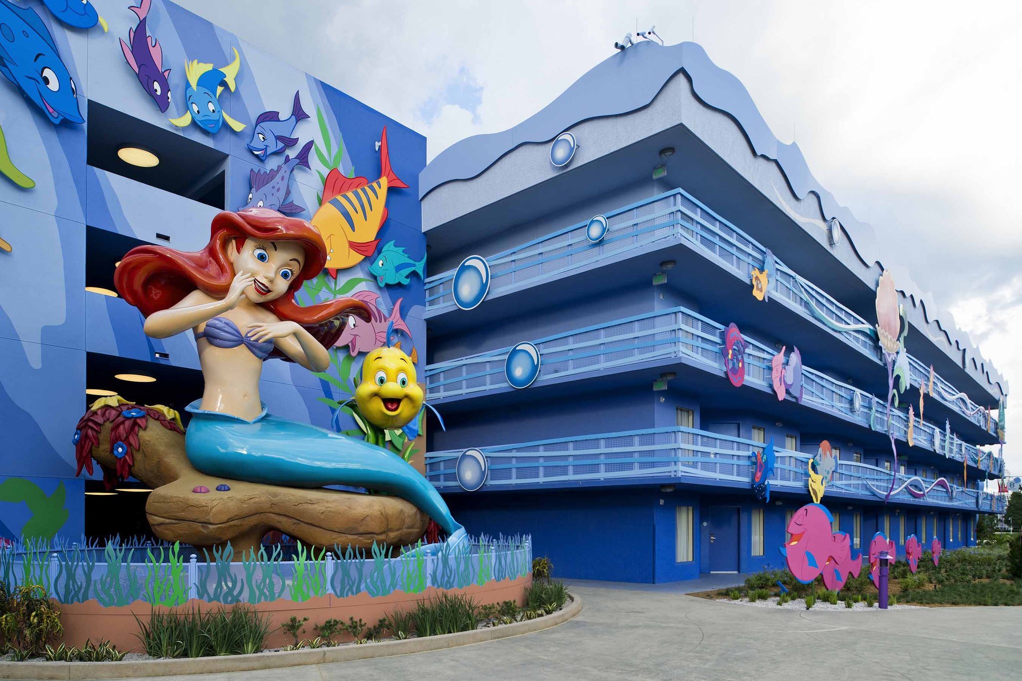 Surrounded by Flounder and friends, a larger-than-life Ariel overlooks "The Little Mermaid" courtyard and Flippin’ Fins pool at Disney's Art of Animation Resort. Beginning Sept. 15, 2012, guests can dive "under the sea" with Ariel and become part of her world when the resort's final phase opens with 864 standard hotel rooms. Disney's Art of Animation Resort is a value property located at Walt Disney World Resort in Lake Buena Vista, Fla. (Matt Stroshane, photographer)